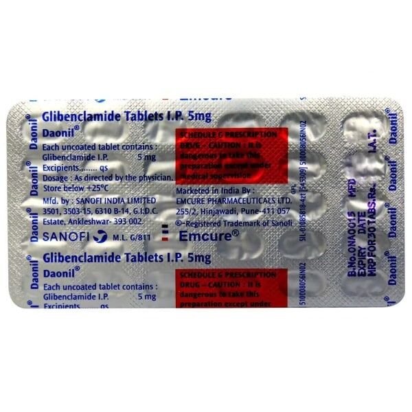 Daonil 5mg represents an anti-diabetic pharmaceutical which exists as tablets under manufacturing by Emcure Pharmaceuticals Ltd. Medical practitioners administer Daonil 5mg to control blood glucose levels within NIDDM patients who have Non-Insulin Dependent Diabetes Mellitus. Glibenclamide regulates blood glucose through medication use to stop nerve problems and kidney problems and eye problems from developing.